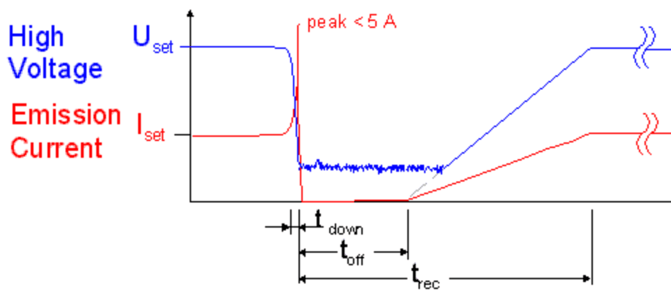 Through a combination of an intelligent arc recognition system and the high switching frequency of the power unit, it is ensured that should any arcs occur they are extinguished extremely quickly. This minimizes the additional energy that would otherwise continue to feed into the arc. Full power is returned within 3 ms to allow the evaporation process to continue. With the aid of a user-set limit for the acceptable arc rate, process integrity can be maintained for processes such as ion assisted deposition.