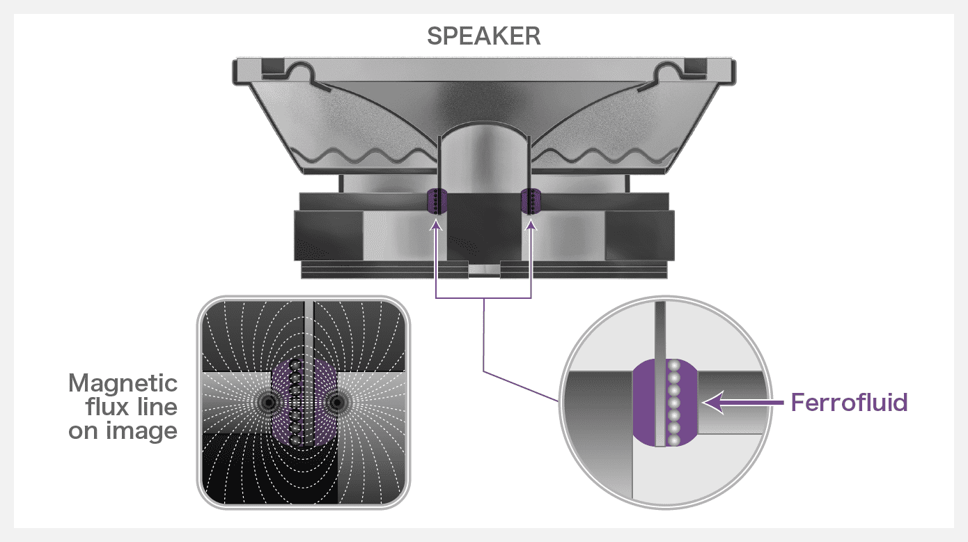 Ferrofluid was developed as a by-product of the space development program in the United States. After that, its application to commercial equipment was considered, and it was applied to the speaker after the seal mechanism. Is only able to function when placed in a magnetic field, and speakers were one of the largest markets for permanent magnets.