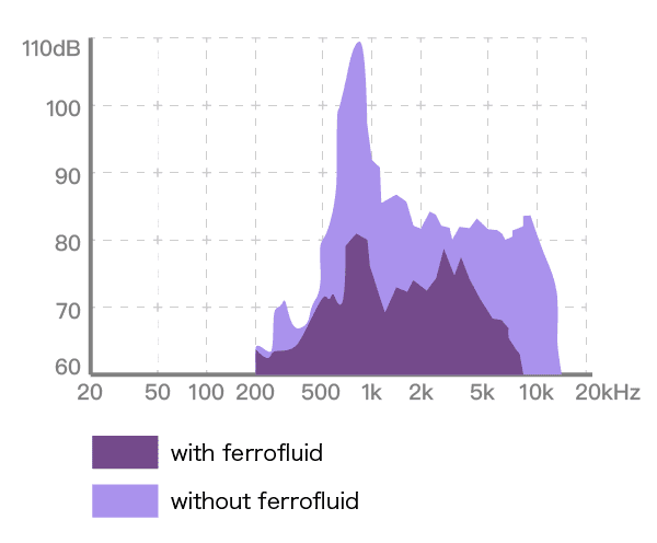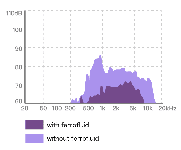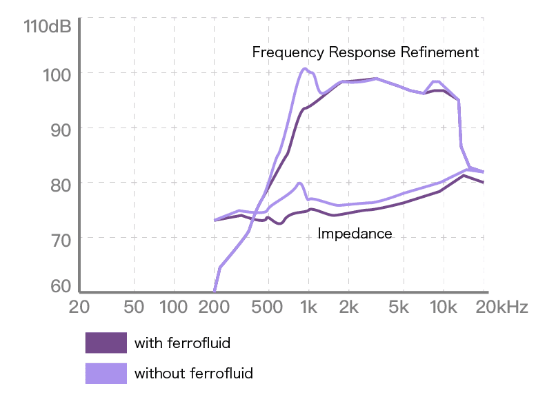 Using ferrofluid increases heat transfer from the voice coil to the magnet assembly. This increases power handling and reduces failures due to thermal transients. Ferrofluid make drivers smaller for same power output. As a thermal conductor, ferrofluid is 600% more efficient than air! These materials further reduce rapid changes of impedance due to temperature change through efficient thermal control.
