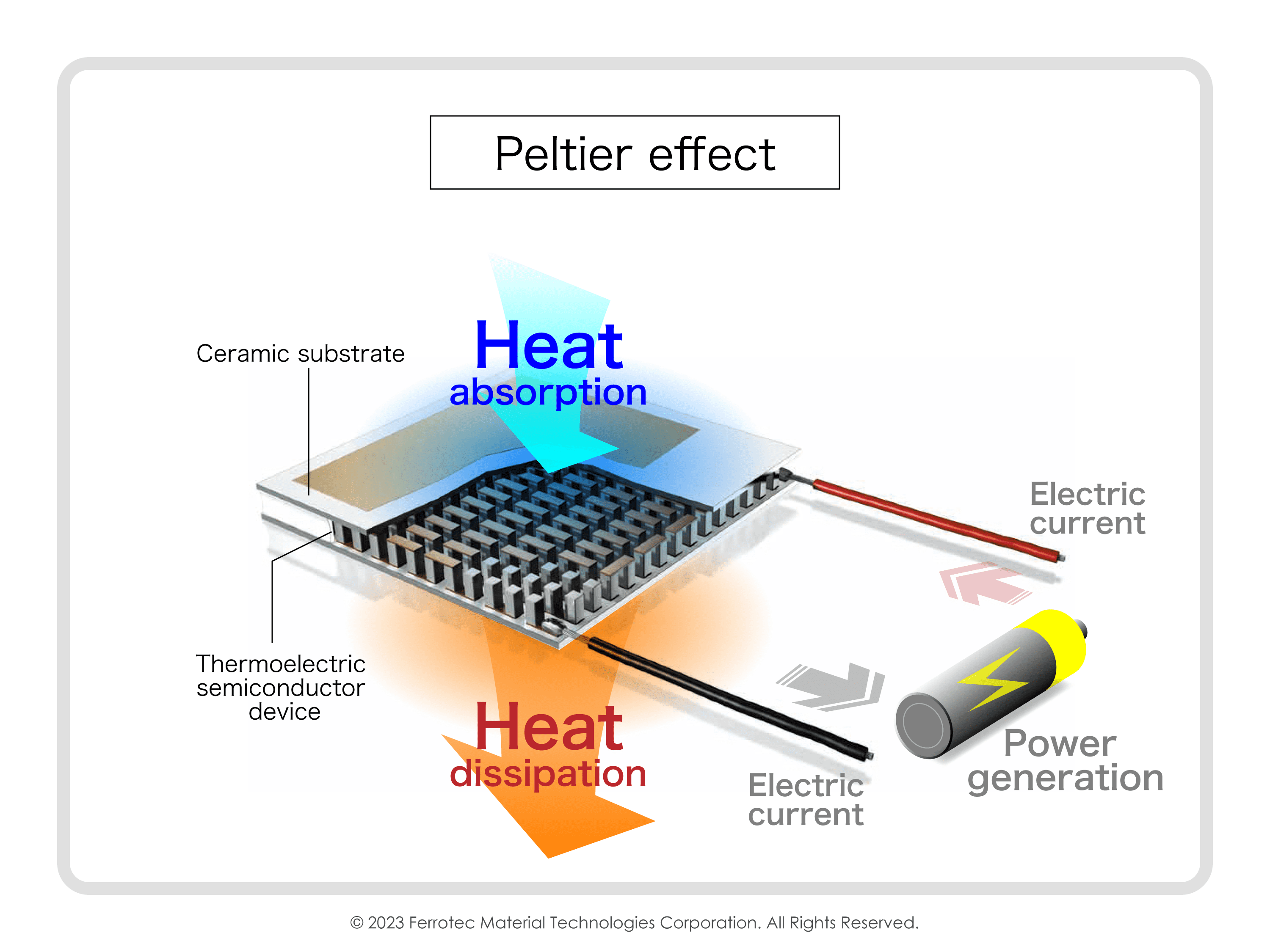 When a direct current flows, heat moves from one side of the thermo-electric module to the other. This is called the "Peltier effect". This phenomenon cools one side of the thermo-electric module and at the same time, the opposite side is heated (See Figure 1 below). Also, reversing the polarity of the DC power supply reverses this phenomenon and heat transfer occurs in the opposite direction (See Figure 2 below). Accordingly, the thermo-electric module can be used for both cooling and heating purposes depending on usage conditions. Precise temperature control will be possible by use in combination with sensors and controllers according to its function.
