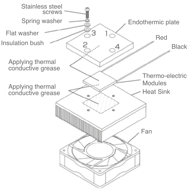 • 3. Also apply heat conductive grease on the heat absorption side, and cover it with the heat absorbing plate.