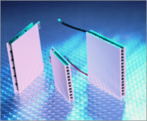 Power generation thermo-electric modules can directly convert heat into electricity with no moving parts as long as there is a temperature difference between both ends of the module. They utilize waste heat and can be used for a wide range of applications including small power generators and power generators used in remote areas where high reliability is required. Power generation thermo-electric modules of NORD are bismuth telluride modules proven in cooling applications. They can be used at a normal temperature of 180℃ or less continuously, or at a transient temperature of 210℃. (Refer to the table below for main properties. The properties are taken at 175℃ on the high temperature side and 50℃ on the low temperature side.) The conversion efficiency of the power generation thermo-electric modules is about 3% under the conditions. Efficiency is expressed as Wload (output) (W)/Qhot (heat flow) (W).