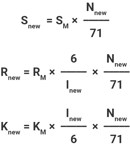 11.2.4 PARAMETER CONVERSIONS FOR OTHER MODULE CONFIGURATIONS: The SM, RM, and KM parameters shown are calculated for a 71-couple, 6-ampere thermoelectric module. If a new or different module configuration is to be modeled, it is necessary to apply a conversion factor to each of these parameters, as follows: