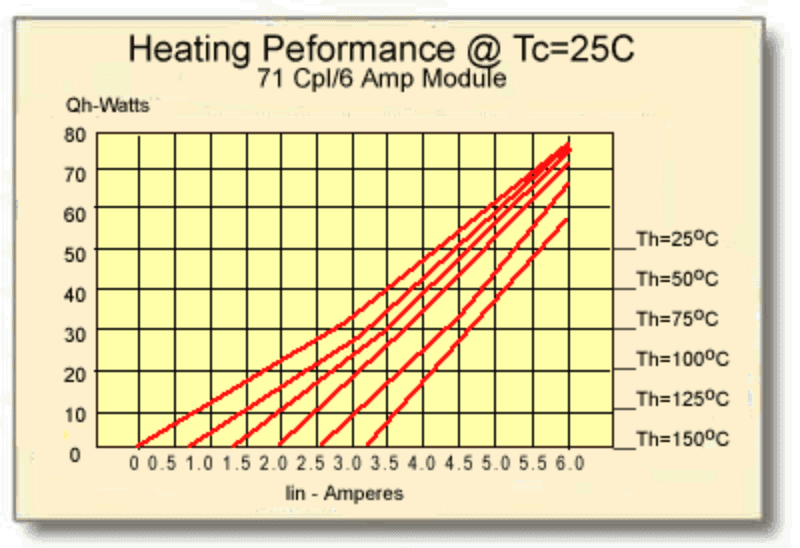 11.5.1 Heating mode performance of a standard 71-Couple, 6-Ampere module is presented graphically in Figures (11-3) and (11-4). These graphs illustrate module performance at a heat sink temperature of 25°C
