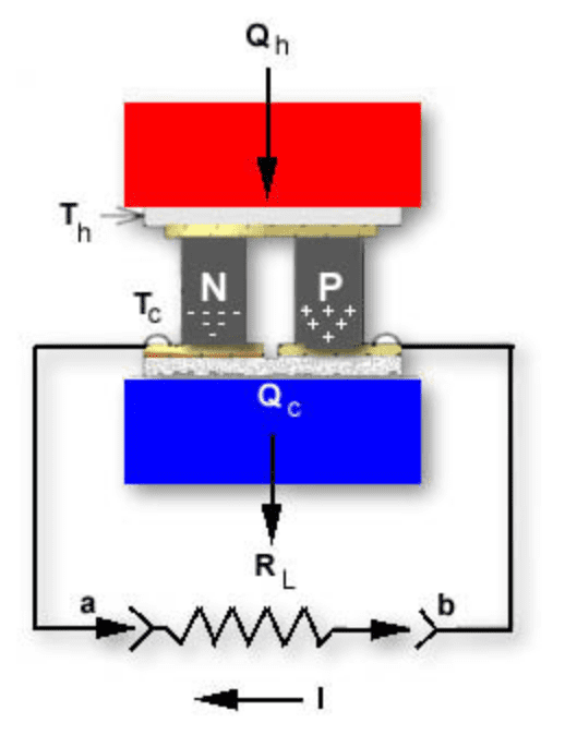 When a load is connected to the thermoelectric couple the output voltage (V) drops as a result of internal generator resistance. The current through the load is: