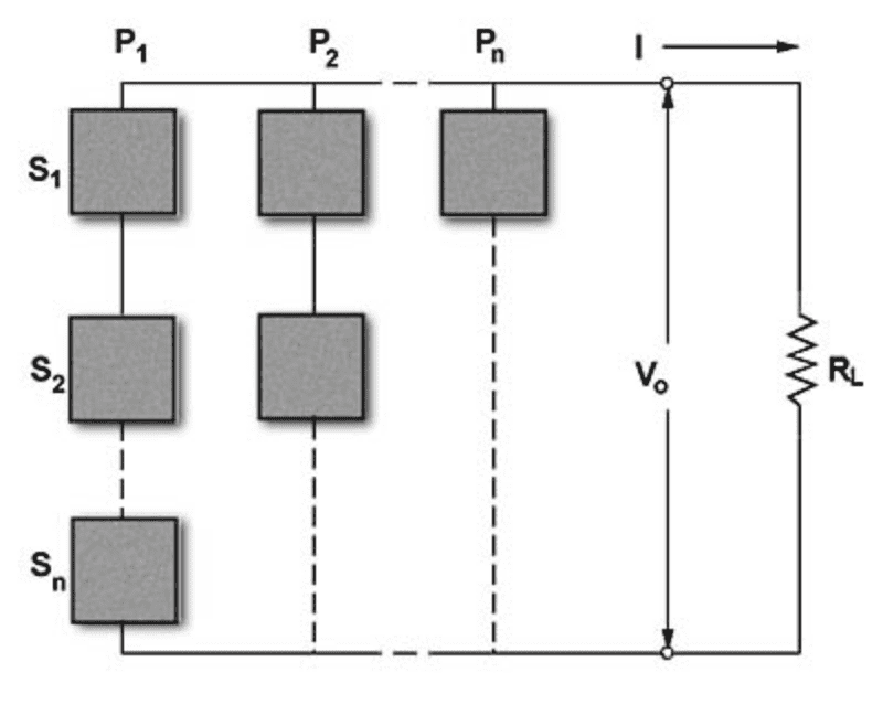 It is possible, but unlikely, that the precise conditions will exist within a given generator application whereby one module will provide the exact output power desired. As a result, most thermoelectric generators contain a number of individual modules which may be electrically connected in either series, parallel, or series/parallel arrangement. A typical generator configuration is illustrated in Figure (13.2). This generator has a NT total number of modules with NS number of modules connected in series and NP number of modules connected in parallel. The total number of modules in the system is: