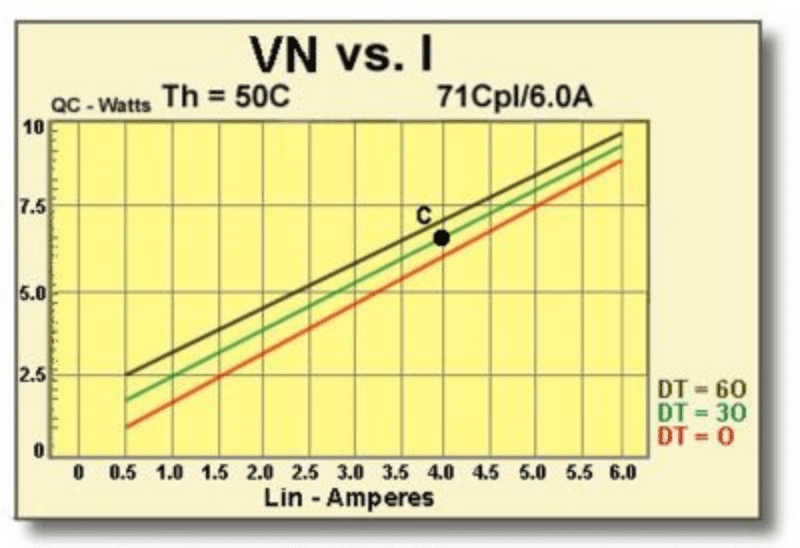 We locate the DT=30 line and, at the 4.0 ampere intersection, mark point D. By extending a line from point D to the left y-axis, we can see that the module’s coefficient of performance is approximately 0.58.