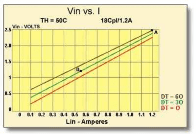 From Figure (9.6) it can be seen that the maximum heat pumping rate (Qc) for DT=30 occurs at point B and is approximately 0.9 watts. Since a Qc of only 0.5 watts is needed, we can follow the DT=30 line down until it intersects the 0.5 watt line marked as point C. By extending a line downward from point C to the x-axis, we can see that an input current (I) of approximately 0.55 amperes will provide the required cooling performance. Referring back to the Vin vs. I graph in Figure (9.5), a current of 0.55 amperes, marked as point D, requires a voltage (Vin) of about 1.2 volts. We now have to repeat our analysis because the required input power is considerably lower than the value used for our initial calculation. The new power and temperature values will be: